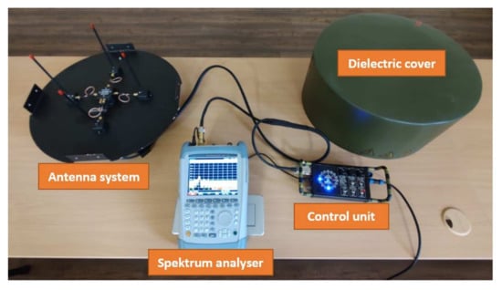 The overall design of IDVOR was based on the required equipment parameters and technical capabilities of the manufacturer. The pursuit of the highest possible compactness and mobility of the IDVOR device was the reason why a four-element antenna system was chosen—an arrangement of four monopoles on artificial ground. In such an arrangement, the minimum distance of the individual elements from each other must be kept. This distance should not be higher than λ/4. The wavelength at the intended test frequency of 430 MHz for targeting the crashed (lost) UAV corresponds to λ = 0.69 m/4 = 172 mm. The Doppler frequency was set at 500 Hz, based on the available component base. From the possibilities of the used multiplexer, from which the switching frequency is derived (Equations (8)–(12)), it was set to 511 Hz [29,30].