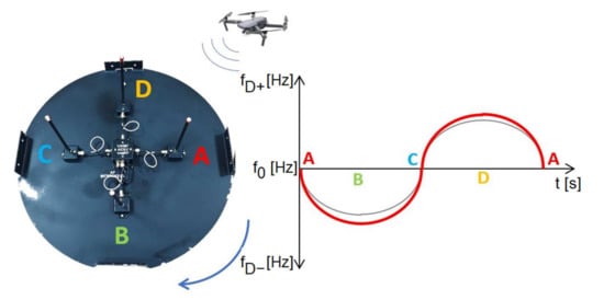 Similar to the DVOR system, our proposed IDVOR (Inverse Doppler VHF Omnidirectional Radio Range) system uses the Doppler principle of direction-dependent signal generation. In our proposed system, the antenna system is switched at high speed by a multiplexer. With four antenna switches, the system appears to the observer as a single antenna rotating in a circle with a switching frequency of approximately 500 Hz, i.e., 500 rpm. The received frequency has an increasing character when approaching the point on the circle that is closest to the transmission source. This means that the frequency of the received signal increases. The received frequency decrease if the antenna moves away from the source (Figure 3).