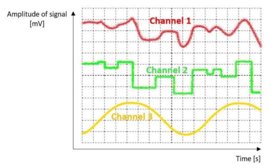 Sample of graphic courses of Doppler signal (after “digitization”), clock and switching signal. Channel 1 (noise + useful audio signal + Doppler shift) represents an audio signal processed from the receiver, which is affected by Doppler shift. Channel 2 (useful audio signal + Doppler shift after modulation and noise filtration). Channel 3 (clear Doppler shift signal)—signal after low-pass filtration.