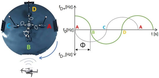 The principle of operation of the IDVOR system is that after capturing and receiving the high-frequency signal and its demodulation, the demodulated signal is adjusted to sinusoidal by means of filters. The phase ratios in this signal compared to the support signal from the multiplexer are decisive. At point A (Figure 3), the received frequency is identical to the support (reference) signal; the relative movement of the antenna is not recorded, so the received signal is in phase with the support (reference) signal. By switching the antennas with a multiplexer clockwise, the antenna makes a relative movement to the signal source; it moves away from the source. For this reason, the received frequency is lower, and a shift is noticeable. The Doppler shift reaches the highest value at point B, so the frequency is the lowest. As the antenna begins to make a relative approach to the signal source, the frequency increases. At point C, the frequency is again equal to the frequency of the targeted transmitter, as it makes no movement relative to it. Analogously, positive frequency values are also acquired. From point C to point D, the antennas perform an apparent movement again, but back towards the source of the targeted signal, the frequency increases again. The frequency decreases again to the source (reference) frequency from point D to point A. After connecting the radio receiver to such an antenna system and tuning it to the desired frequency, the switching frequency is audible as a sound with a frequency of 500 Hz after demodulation. This rotational motion can be plotted as a sine function (Figure 4). The timing must be accurate and, at the same time, the same for the antenna multiplexer and the rest of the targeting system [19,20,21,22,23,24,25].
