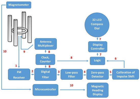 The printed circuit boards were designed in the CAD/CAM EAGLE Layout Editor environment and made to order at the supplier. The larger printed circuit board, called MAINBOARD (dimensions 145 mm × 100 mm), contains all the circuitry needed for antenna switching and Doppler signal analysis. The smaller board (dimensions 60 mm × 60 mm) contains the IC7 4051 controller for the compass rose of the evaluation device, consisting of 32 LEDs. The compass rose allows the reading of directional information with an accuracy of 5.5° if two adjacent LEDs light up simultaneously. A separate reading provides a resolution of 11°. Course (directions) 000°; 090°; 180° and 270°are indicated by blue LEDs, course (directions) 045°; 135°; 225° and 315° are indicated by yellow LEDs. Red LEDs indicate other courses (directions).