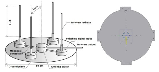 The antenna system design for IDVOR (Figure 7) must consider all aspects of use as a mobile tracking/targeting system. As mentioned, the antenna system is structurally based on the principle of a quadruple monopole [33] with a wavelength λ/4, arranged in a cross on an artificial ground, formed by the aluminium sheet. The 50 cm diameter sheet metal itself was cut with a CNC milling machine. The size was deliberately chosen as it is necessary to provide a sufficient counterweight of 12 cm from the monopole and, at the same time, be 12 cm from the centre (Figure 7).