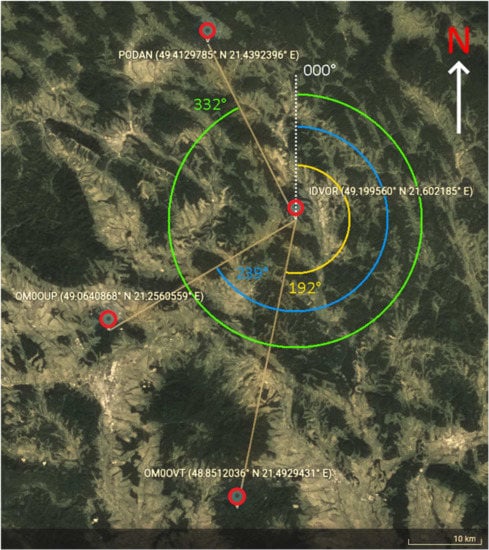 Testing in real conditions (summary of the parameters is in Table 2, and a visualisation of the situation is in Figure 10) took place in the field with an elevation of 49.199560° N 21.602185° E at an altitude of 415 m a.s.l. After assembling the IDVOR set and placing the antenna at the height of 2 m above the ground, the IDVOR antenna system was oriented with a reference point to magnetic north according to the integrated comparison compass. Subsequently, the receiver was tuned to the frequency of the amateur radio converter OM0OUP, located at the elevation of Furnická Stráž near Prešov, transmitting on the frequency 439.1 MHz; this converter was chosen as the initial test point simulating a crashed UAV device. Another radio station remotely activated this test transmitter to the broadcast state; thus, the targeting testing began. The test transmitter was immediately targeted, and the direction displayed on the compass rose at 236°. The position of the test transmitter was verified using a mobile targeting device, which determined the course (direction) with a value of 239°.