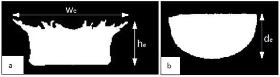 Size parameters of the experimental crown (a): he—crown height, we—external width of the crown. Size parameter of the experimental cavity (b): de—depth of the cavity. Index “e” specifies the results from the experiment.