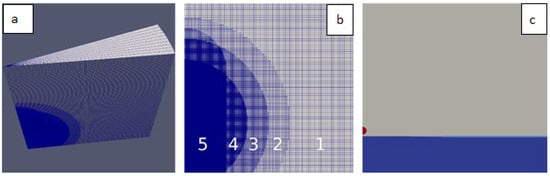 In the simulations used for experimental comparisons, axial symmetry of the phenomenon was assumed. This assumption was valid if we focused on all the observed phenomenon elements (i.e., wave, crown, cavity, and jet formation) other than the formation of crown spikes and detaching satellite droplets. The experimental validation confirmed the validity of this approach. The simulated area had a wedge-like shape of 60 mm in height and 60 mm in radius (Figure 2a). The mesh was generated by rotationally extruding a 2D initial mesh. Cell refinement was applied in the mesh generation in the drop impact area (Figure 2b). The initial size of the cells was 0.6 mm, and it was twice smaller in each subsequent refinement region, reaching a final size of 0.0375 mm. The total number of cells in the mesh was 3.3 × 109.