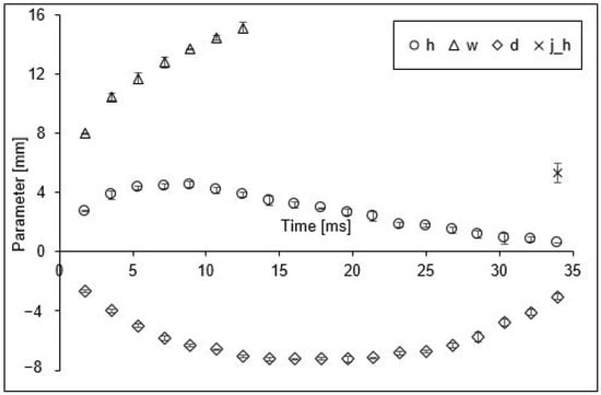 Similarly, as in the case of the variants taking into account the change in the drop diameter, here the crown height parameter reached its maximum at 8.9 ms (Figure 8a), while the cavity depth parameter reached its maximum at 17.9 ms (Figure 8c). The parameter determining the width of the crown was characterised by a constant increase in value (Figure 8b).