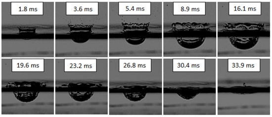 The crown width was recorded only up to about 12 ms, which is due to the fact that this was the last moment of the existence of the “classical” crown. Up to that point, the crown was well formed and its width could be clearly determined. After about 12 ms, the crown began to fall and lose its shape, forming a drifting wave of water (Figure 5).