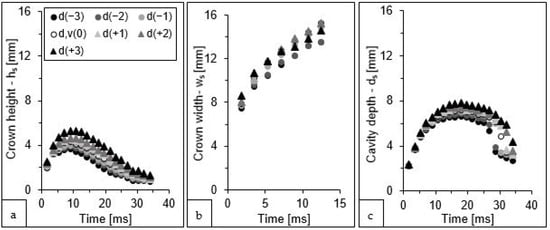 The change in the drop size had a significant influence on the parameters of the subsequent model variants. As could be expected, the larger the drop, the larger the sizes of the crown and cavity. However, this influence changed with time. For instance, any error in the measurement of the drop size had the biggest potential to influence the crown height in the period of 7 to 23 ms (Figure 6a), where the difference between the largest and smallest height of the crown was approximately from 1.6 to 2.0 mm. The greatest diversity of subsequent model variants was observed for the crown height at 21 ms—approximately 2 mm, which accounted for as much as 57% of the maximum value. Before and after this time interval, the influence was also visible but smaller (0.3 to 1.3 mm difference between the extreme values).