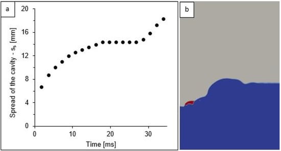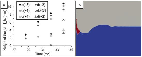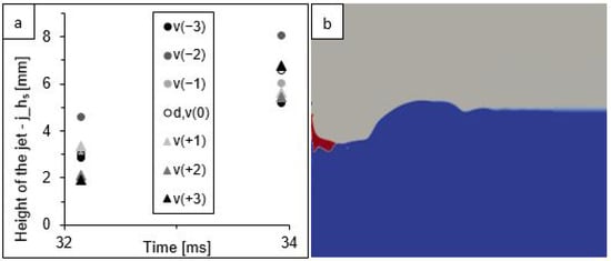 In Figure 4, the recorded height of the jet is marked at the last analysed moment. The fact that the jet was noticed for the first time at 34 ms does not mean that it was not formed earlier. However, identifying it at an earlier stage was not possible because it formed at the bottom of the cavity before the liquid surface levelled out. This was confirmed by the values of the height of the jets shown in Figure 7 and Figure 9, wherein some variants of the simulation, there were jets with a lower height than the still observable cavity depth. This is particularly evident in the image of the example simulation shown in Figure 9b.