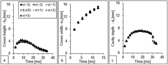 The change in the impact velocity affected the differentiation of the analysed splash parameters to a much lesser extent than the change in the drop diameter. The graphs presented in Figure 8c show that the values of the cavity depth differed between the extreme variants—v(−3) and v(+3)—by a maximum of 8%. A slightly greater differentiation between the extreme variants was observed for the height of the crown (Figure 8a). For this parameter, the maximum difference was 28%, but it occurred only at certain moments in time and not throughout the duration of the simulation. In the case of the external width of the crown (Figure 8b), the differences between the largest and smallest values oscillated around 0.3 mm, which accounted for only about 2% of the maximum crown width at a given time.