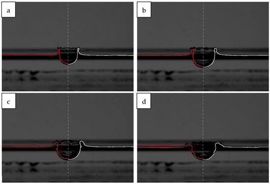 The 2D cross-sections of the simulated fluid configuration for subsequent time steps were extracted using ParaView software [50] (Figure 3a) and were analysed in GIMP. First of all, the cross-sections were scaled to match the size of the images of the real phenomenon, i.e., the size of the images from the camera. Next, the images were converted to the indexed mode with a one-bit colour palette. The next step was to return to the RGB mode, in which a given colour (e.g., background) was converted to transparency. As a result, only the line on the phase boundary remained on the images (liquid–air: Figure 3b,c, or water–petrol: Figure 3d). Then, the same procedure as that described for images of the real splash phenomenon was followed, i.e., specific points were applied to the images and the distances between them were automatically determined, obtaining the following parameters of different splash forms: