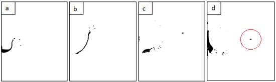In our simulations, as the cavity depth began to reduce, water and petrol that had drained from the walls began to erupt in a jet form. Figure 12d shows the moment when the formation of the jet began, with the top of the jet formed by the collected petrol. After the splash phenomenon ended, when the liquids in the vessel had levelled out, the greater part of the petrol was collected centrally at the point of the drop impact, while its smaller part was ejected as satellite droplets that detached from the crown and carried the contamination up to a distance estimated as several centimetres. The process of droplet detachment from the crown spikes is shown in Figure 13b,c, while the location of the “landing” of a petrol droplet is indicated in Figure 12d.