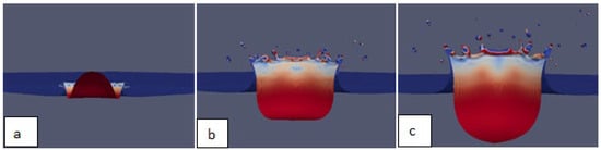 For the depth of the cavity (Figure 6c), steadily increasing changes were observed from 0.1 up to about 3 mm, which was from approximately 5 to 50% of the maximum depth value at a given time. In addition, another interesting relationship was observed, where the values at 28 ms for the two least energetic variants (models d(−3) and d(−2)) were significantly lower than for the other simulations. At the next analysed time (30 ms), a similar effect was observed for the variants with the three smallest diameter drops, at 32 ms for five variants, and at 34 ms for six variants. This observation is undoubtedly related to the fact that, at these four specific times and for the above-mentioned simulation variants, the appearance of a jet (Figure 7), formed from the collected liquid, was recorded. This secondary form “disturbed” the course of the free dissipation of the cavity below the surface of the liquid.