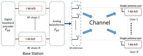 Millimeter wave (mmWave) communication can offer high data rates and low latency for outdoor and indoor cellular systems and hence is an important candidate in the fifth generation (5G) mobile communications [1,2,3]. In mmWave communications, a large number of antennas with beamforming are required to overcome the high propagation path loss [4]. However, the hardware complexity, energy consumption, and channel estimation overhead generally increase with the number of antennas, which impose constraints on the application of mmWave communication [5,6].