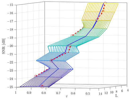 A demonstration for quantization threshold, , and detection repetitions, L, versus SNR [dB] with .