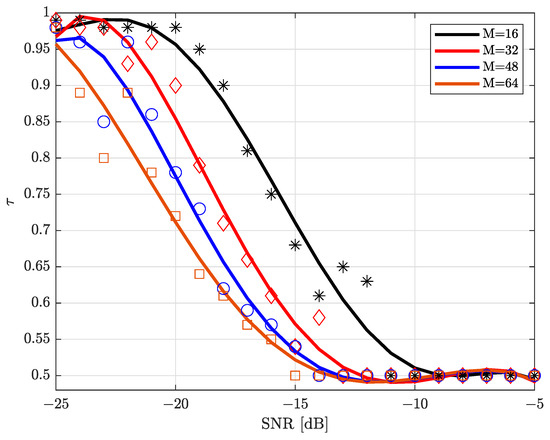 Based on simulation results given in Figure 3, we can further approximate the relationship between , SNR, and M as follows: