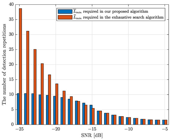 Figure 4 compares the minimum number of detection repetitions, , obtained by utilizing the proposed algorithm with that of the conventional exhaustive search algorithm for . It is clear that our proposed algorithm can significantly reduce the required number of detection repetitions in the low SNR regime, which verifies the effectiveness of our proposed algorithm.