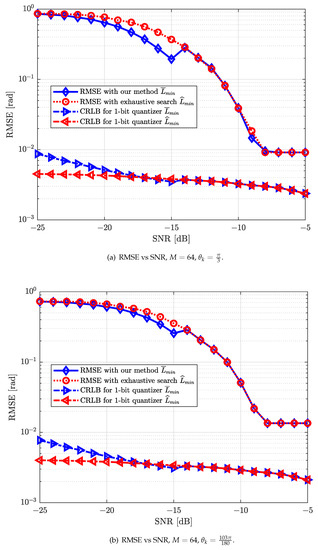 To verify the estimation accuracy of our proposed algorithm, we use the RMSE of the strongest AoA estimate as a performance metric. Meanwhile, the best achievable RMSE estimation performance benchmark with , , can be characterized by deriving the approximated 1-bit CRLB with additive quantization noise model (AQNM) of the antenna array [39].