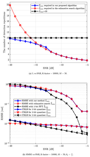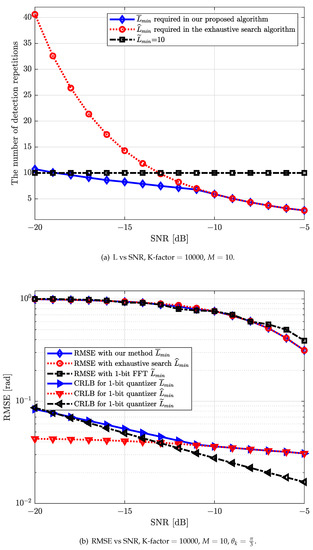 (a) The number of detection repetitions required for different algorithms versus different SNR for ; (b) RMSE [rad] versus different SNRs for with our proposed beamforming direction search algorithm, the exhaustive search algorithm and 1-bit FFT.