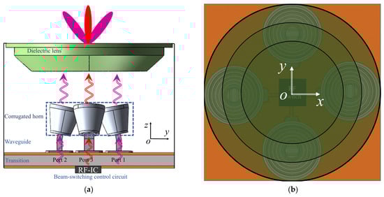 Schematic of the proposed lens antenna with reconfigurable beams. (a) Side view. (b) Top view.