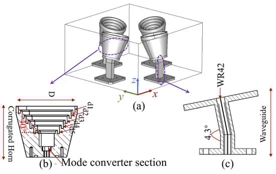 Radiators consists of four horn antennas. (a) A 3D review and geometry of the (b) corrugated horn and (c) waveguide.