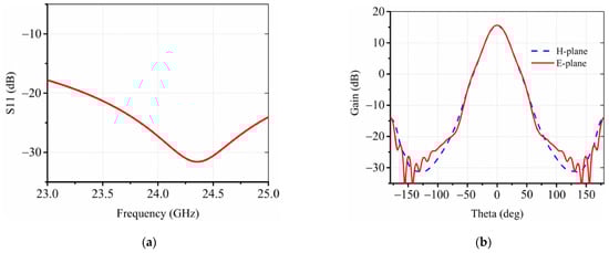 As shown in Figure 2a, the radiator consists of four corrugated horn antennas operating at 24 GHz with 15° tilted angles. Each corrugated horn antenna has five grooves as marked as d1 to d5 in Figure 2b, to generate desired modes of TE11 and TM11, symmetric radiation patterns, and low sidelobes [29]. A WR-42 waveguide propagating the TE10 mode is utilized to realize a smooth connection between the RFIC board and the horn antenna. As shown in Figure 2c, the transition waveguide is designed to have a certain length to eliminate the high order mode caused by the discontinuity of the structure; meanwhile, it has a 4.3° bending angle for the horn antenna to minimize the unwanted phase aberration and improve the projection area of the lens that decreases towards the larger steering angle. More specifically, after the last grooves a short-length mode converter, as shown in Figure 2b, is designed for converting TE10 modes from the waveguide to the TE11 mode in the horn antenna. The corrugations on the side wall of the horn provide the boundary condition to excite the HE11 mode, which is a mixing mode equivalent to the synthesis of TE11 and TM11 modes [29]. The polarization of the corrugated horn is linear polarization, and four horns have rotational symmetry around the center, so that both the vertical and horizontal polarizations can be provided. As shown in Figure 3a, the horn antenna has a wide bandwidth from 23 to 25 GHz, while the gain of radiation patterns is around 15 dBi, as shown in Figure 3b, thereby radiating waves upward to the dielectric lens for modulating the phase and shaping the radiation patterns. Relative parameters in Figure 2 are d1 = d2 = 5.27 mm, d3 = d4 = 5.33 mm, d5 = 5.53 mm, and D = 42.5 mm.