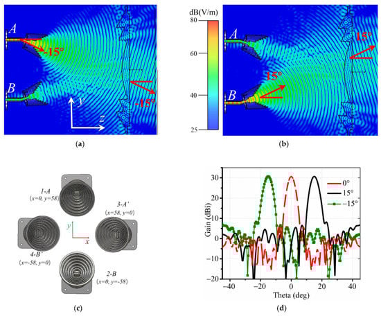 Furthermore, as shown in Figure 5a, for another focal point A (x = 0, y = 58 mm) that is shifted from the referenced point O (x = 0, y = 0), the wave follows the same propagation path, but the radiation beam tilts to a certain angle −15° to the z-direction as well. Similarly, as demonstrated in Figure 5b, the other horn antenna located downward at B (x = 0, y = −58 mm) produces waves in the 15° direction, and the transmitting waves through the lens go to the 15° direction. Therefore, two antennas in H-polarization and another couple of antennas in V-polarization are employed in the focal zone with different locations A (x = 0, y = 58 mm), A’ (x = 58, y = 0 mm), B (x = 0, y = −58 mm), B’ (x = −58, y = 0 mm), as shown in Figure 5c; thus, we can realize four reconfigurable beams, as shown in Figure 5d. Relative parameters in Figure 4 are r1 = 116 mm, r2 = 165.8 mm, and r3 = 220 mm.