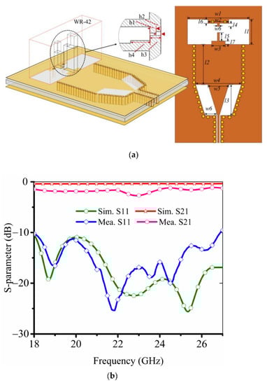 To integrate with the circuit, the SIW-to-waveguide transition is designed to feed the corrugated horn. Generally, the transition for the millimeter wave system is the microstrip-to-waveguide structure [31,32], which requires the extra 1/4 waveguide wavelength of the short-circuit waveguide. However, in the practical application, due to the size limitation, the waveguide needs to be designed to obtain a wideband transition structure at the K-band. As in Figure 6a, the proposed transition structure consists of three parts: SIW cavity, double-ridged waveguide, and grounded coplanar waveguide transmission line (GCPW). The substrate is 0.168-mm-thick Rogers 4350B. The double-ridged waveguide has a large cutoff frequency of main mode (TE10) and a wide bandwidth from 18 to 27 GHz, as demonstrated in Figure 6b, covering the frequency bandwidth of the lens antenna. In summary, the whole lens antenna system has good performance from the horn antenna source, dielectric lens, and the transformation part.
