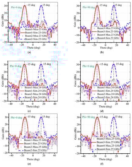 The measured and simulated radiation patterns are shown in Figure 8, which illustrates a good agreement between simulations and measurements in all four beams. The measured gain and sidelobe from 23 to 25 GHz stabilizes around 30 dB and the sidelobe level is below −20 dB, validating the design with four reconfigurable beams in both H- and V-polarization.