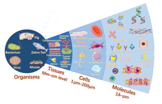 Owing to the strengths of biolasers, kinds of biolasers have been utilized to detect or monitor various bioactivities at the molecular [30,31,32,33,34,35,36,37,38,39,40,41,42,43,44,45,46,47,48,49,50,51,52,53,54,55,56], cellular [57,58,59,60,61,62,63,64,65,66,67,68,69,70,71,72,73,74,75], tissue [76,77,78,79,80,81,82,83,84,85,86,87,88], and organism levels [89,90,91,92,93,94,95,96,97], Recently, their applications in cell tracking, labeling/probes, implantable devices, and cell/tissue imaging have started to emerge. However, molecular, cell, and tissue functions should be independently distinguished in the complex biological field, and all of the previous reviews have not separated and described various bioactivities at the molecular, cellular, tissue, and organism levels with kinds of biological lasers. In this review, we discuss distinct biolasers and their potential biological and biomedical applications at all levels, as shown in Figure 1. In the end, we present an outlook on the possible challenges and future directions of biolasers.