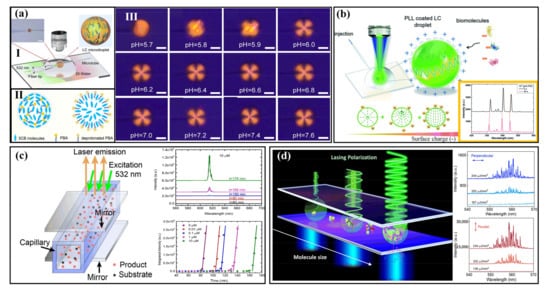 Over the last couple of decades, many works about the detection of biological environments have been performed. For example, in pH sensing, Watanabe et al. utilized the intensity of lasering emissions based on a photonic crystal nanolaser fabricated with GaInAsP which is controlled by the change in the redox potential to identify the pH of a solution [35]. In 2017, a pH optical sensor based on random lasing was developed, and it showed pH sensitivity 200-fold higher than that of previous fluorescence sensors [38]. The high sensitivity makes the laser signal promising for biosensing applications. The detectable shifts in spectra are able to assume the role of an indication of the hydrogen ion concentration which is released from the enzymatic reaction. In the same period, Wang et al. reported a microdroplet-based pH sensor created by liquid crystals (LCs) and investigated the capacity of monitoring enzymatic reactions in penicillinase [34]. The combination of molecules and surfaces of LC droplets can alter the electromagnetic property and alignment of the LC droplet’s internal structure, resulting in distinct laser emissions with various wavelengths and modes. Figure 2a presents a pH sensor based on LC droplets doped with 4′-pentyl-biphenyl-4-carboxylic acid (PBA). Characterizing biosensing properties using changes in lasing spectra and modes is becoming more and more attractive. In this mechanism, the designed micrometer-sized microdroplets show transitions in configuration from bipolar to radial as the value of phosphate buffer solution (PBS) pH increases by 0.3, resulting in distinct signals in laser emission spectra.