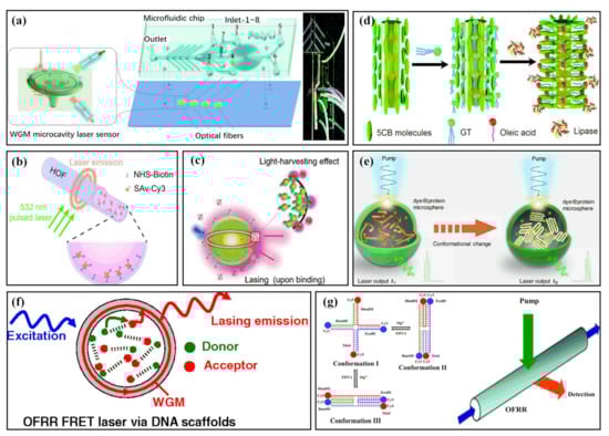 DNA, which is important for all life forms, is a molecule consisting of two polynucleotide chains that are wound around to form a double helix, carrying genetic instructions about function, development, growth, and heredity for the vast majority of living organisms. Bioinspired optofluidic ring resonator (OFRR) FRET lasers that can be precisely controlled by DNA scaffolds were demonstrated, as displayed in Figure 3f. This kind of biolaser is a rising technology that cooperatively integrates microfluidics and a dye laser for miniaturized lasing sources possessing straightforward sample delivery and extremely small sample volumes [99,100,101,102,103,104]. Through DNA scaffolds, almost 100% energy transfer can be realized without considering the concentration of donor and acceptor. As a consequence, the laser can be obtained at a very low acceptor concentration, approximately 1000-fold lower than that of traditional optofluidic dye lasers [44]. DNA is one of the four important types of biomacromolecules which are essential in life processes. The normal activity of DNA determines genome stability to maintain life. However, changes to the DNA sequence may occur, namely base changes caused by biological processes such as mutation and cytosine methylation, which are of great significance in disease diagnosis and customization. In 2012, Lee et al. proposed an intracavity DNA melting analysis mechanism based on an optofluidic laser. The tiny signal change between the DNA with single-base mismatching and the target was optically amplified by the resonant laser, causing an orders of magnitude larger signal than fluorescence methods. The difference between two DNA sequences greater than 100 bases long was proved [40,48]. In addition, changing the structure of DNA can achieve the control of the biolasers. By controlling the Mg2 + concentration in the solution, a DNA Holliday-based biofluidic laser was successfully manufactured (Figure 3g). The two laser gain media (Cy3 and Cy5) attach to the same DNA structure at the same time, and the invertible wavelength conversion can be realized by inducing DNA conformational changes (e.g., Mg2+) [45,49]. Another attractive property of DNA is that DNA is negatively charged because of the phosphate groups. The above-mentioned GaInAsP semiconductor photonic crystal nanolaser has the capacity to detect surface charge [35]. Once the device encounters the plasma and the charged DNA is adsorbed, a big wavelength difference Δλ exceeding 1 nm occurs. Hence, it also is used to identify DNA at very low concentrations [36]. Through various methods to distinguish error, DNA can play a key role in disease inspection, customized medicine, and basic life research [36,48,105,106,107]. In addition, DNA can be used to prepare biometric switching laser emission devices. A DNA-based self-switchable laser was proposed in which the laser uses a biological interface between the Fabry–Pérot microcavity in the nonlabeled DNA molecule and the dye-doped liquid crystal matrix. By using the DNA conformation and the change in the liquid crystal direction, laser emission switching between different wavelengths and strength is achieved, possessing a wide spectral range of reversibility and wavelength adjustability which can play an important role in biological monitoring [108].