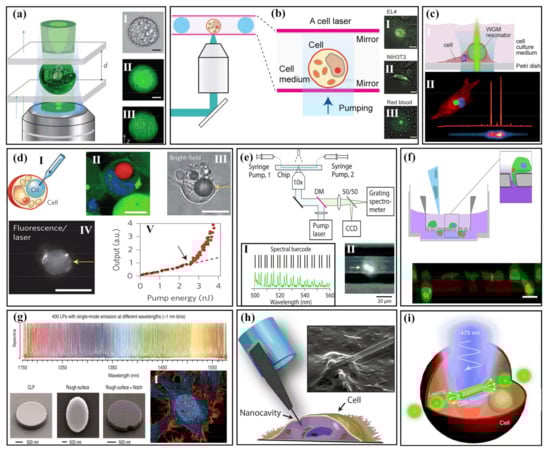 To obtain a high Q-factor, which is significant for sensing applications, WGM resonators need near-spherical, smooth surfaces with small scattering losses. The first demonstration of an intracellular spherical biolaser was realized by Hummar et al. with Nile-red-dyed oil microdroplets acting as soft WGM cavities in cells, as exhibited in Figure 4d. These authors injected the oil into the cells using a microsyringe attached to a glass microtube with an outer diameter of 1 μm. Due to the immiscibility of the oil droplets and the pressure of the cytoplasm, the droplets can keep good shapes. The droplets were first introduced into the cells, and the free space exciting approach of the oil immersion objective was used to excite the WGMs and collect the signal. Fortunately, there are cells that naturally contain lipid droplets, such as adipocytes. With the development of various fields, many similar cavities have appeared [116,117]. Following mixing with lipophilic fluorescent dyestuff and excitation by a nanosecond laser, an adipocyte containing a single lipid droplet realized WGM lasing. Aside from soft cavities, solid cavities are also popular due to their stability and usability [118,119,120]. A non-deformable WGM cavity can be produced using solid microspheres, such as polystyrene (PS) microspheres. PS microspheres are easily internalized by cells. Researchers achieved different WGM lasers with multiple positions of gain material, distributed on the inside, outside, and surface of the beads. Moreover, distinct PS microspheres with various diameters could create a set of output spectra that can operate as a fingerprint identification code for cell tagging, tracking, and sensing [61].