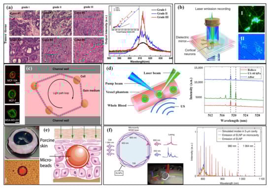 Due to the much greater scattering and absorption of tissues than cells, a greater light field strength is required to obtain the signal. An FP cavity is an excellent choice that can support a high-power standing-wave field. In this regard, Fan’s group has completed a series of studies. A scanning laser emission microscope for mapping laser emission in human tissue was proposed. Patients’ tissues labeled with particular dyes for various biomarkers were sandwiched in an FP cavity. Subsequently, an optical parametric oscillator (OPO) pulsed laser was guided into the cavity to build a laser-emission image that can show the deviation between cancer and normal lung tissues [79]. Similar lasers were proposed for many other tissues, such as bone tissue, blood tissue, muscle tissue, adipose tissue, and other functional tissues. As depicted in Figure 5c, by exciting and recording single neurons from neural networks, neuron activities can be recognized, which can help us understand neurological diseases and signaling [76].