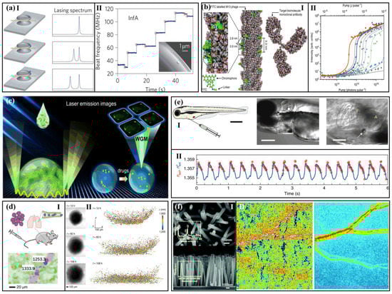 Representing another application in addition to virus sensing, bacteria are relatively widely distributed in the organisms of the world [93,94]. In 2021, to achieve high-throughput application, a microdroplet laser array encapsulated by Escherichia coli was printed on a high-refractive-index mirror, as illustrated in Figure 6c. With the pumping of 490 nm wavelength, a laser emission image that can serve as evidence of dynamic changes in living organisms was obtained [93]. More exciting results are emerging in larger organisms, such as zebrafish and mice [89,90,95,96]. Large-scale single-cell tracking was achieved based on WGM laser microdisks made of silica-coated semiconductors, which can support single-mode emission over 1170 nm to 1580 nm with sub-nanometer linewidths. Cells stained with dyes and loaded with microparticles were injected into the tail vein of a mouse to mimic a model of blood-vein micrometastases. Fifteen minutes later, the lung tissue was imaged, showing the ability of multiplexed tagging of a large number of cells even in scattering tissues. More details about the three-dimensional tracking of the tumor spheroid model are depicted in Figure 6d [89]. Recently, Gather and co-workers achieved organ monitoring with the aid of WGM microlasers, as shown in Figure 6e. Microsphere resonators with diameters between 10 and 20 µm were inserted in the heart, receiving a wavelength shift of 50 pm caused by the cardiac contraction, which allowed accurate monitoring of organ-scale contractility in live zebrafish with extraordinary repair and regeneration ability and mouse heart tissues. The microspheres were implanted using a micro-syringe into the outer wall of the atrium of the zebrafish. Under the optical pumping, lasing wavelength from microlasers displayed a redshift corresponding to the heartbeats [96].