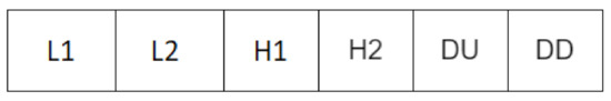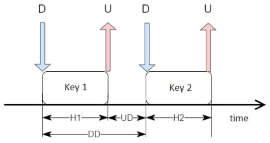 Because the event duration, given in milliseconds, might not be sufficient to train the network correctly, some processing steps were required to prepare more comprehensive temporal characteristics, as shown in Figure 1. The letters D and U represent "down" and "up" and indicate the times of pressing and releasing the key, respectively. H1 and H2 are durations of holding two subsequent keys. They were calculated by the time difference between U and D. UD is the value of the time difference between pressing the next button and releasing the previous one. Finally, DD represents the period between pressing the key and the next one.