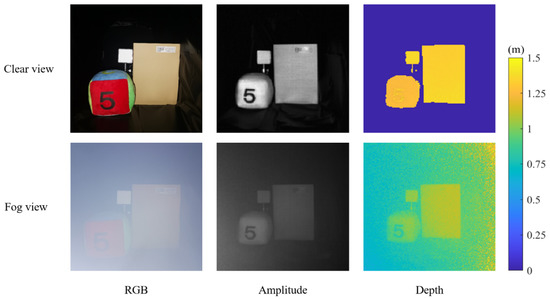Time-of-flight (ToF) imaging is an active depth-sensing technology with the advantages of a compact structure, low cost, and real-time image capture [1]. It is widely used in many fields, such as autonomous driving [2], machine vision [3], and human–computer interaction [4]. The continuous-wave ToF (CW-ToF) camera is a common depth-sensing camera, which indirectly acquires depth images by calculating the phase difference between sent and received signals [5], simultaneously capturing amplitude images of a scene. When a CW-ToF camera is used in foggy scenes, the contrast of the amplitude image is degraded and the depth image is greatly distorted, which limits the ToF camera to be applied in outdoor settings, as shown in Figure 1. Therefore, it is necessary to improve the quality of the images captured by a ToF camera in fog.