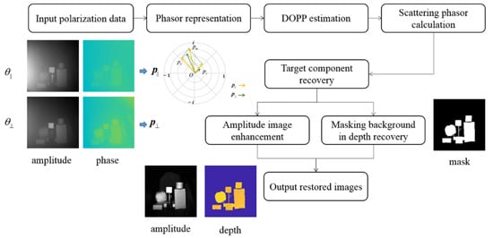 The polarization phasor imaging method processes and analyzes polarization data in polar coordinates. First, a group of polarization images is captured at two orthogonal orientations of the linear polarization analyzer. The amplitude and depth captured at the same orientation are combined to form a phasor. Afterwards, the background is selected to estimate the degree of polarization phasor of the scattering component. After obtaining the scattering component, the amplitude and depth of the target component can be recovered. For a better performance, the image enhancement is applied in the amplitude, and masking background is used in the depth image. The pipeline of the proposed method is shown in Figure 2, and the details are discussed below.