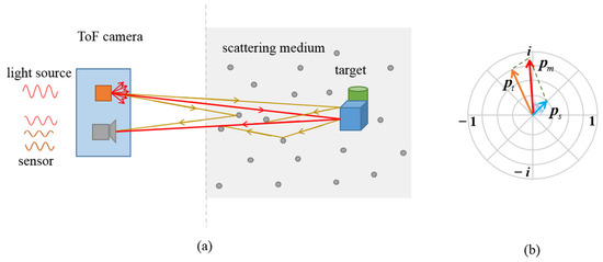 When the scattering medium exists in a scene, the signal received by ToF cameras is not the single-path reflected light from the scene, but the summation of the directly reflected light and multipath scattered light. This phenomenon is contrary to the principle of the ToF measurement, so significant errors are induced. Figure 5 shows the process of ToF imaging in fog, and the corresponding phasor representation. Assuming that the scattering medium is spatially uniform, the observed phasor is the composition of the phasors from the target and scattering components, as shown in Figure 5b, and expressed as