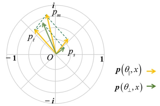 We assume that the proportion of scattering component is higher in the observed measurements measured at θ | | than that measured at θ . In this case, a m ( θ | | , x ) > a m ( θ , x ) , and a s ( θ | | , x ) > a s ( θ , x ) , as shown in Figure 6. If φ s ( θ | | , x ) = φ s ( θ , x ) , P P s is a constant and same as the degree of polarization. Combining the above equations, the scattering phasor can be calculated from