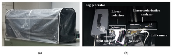 Figure 7. Experimental environment for polarization phasor imaging. (a) Fog chamber. Experiments with fog are conducted in this fog chamber. (b) Experimental setups.