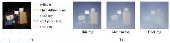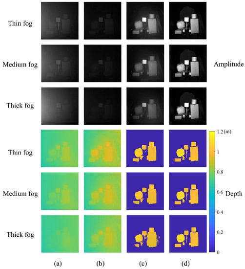 The experiment scene is shown in Figure 8a, which contains five targets: a cylinder made of white paper, white diffuse plane, plush toy, kraft paper box, and blue box. The distance between the targets and the sensor was roughly 1 m. We tested our method under different thicknesses of fog (Figure 8b), and the numbers of scattering particles per cubic decimeter are 753,640, 935,340 and 1,204,890, corresponding to thin, medium, and thick fog, respectively. The experiment results are shown in Figure 9, and the quantitative evaluations of the amplitude and depth images are listed in Table 1 and Table 2, respectively.
