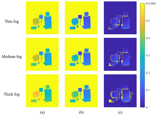 Figure 10. Absolute error of depth under different thicknesses of fog. (a) The absolute error of the image captured by an ordinary ToF camera at θ | | . (b) The absolute error of the image captured by an ordinary ToF camera at θ . (c) The absolute error of the image recovered by our method.