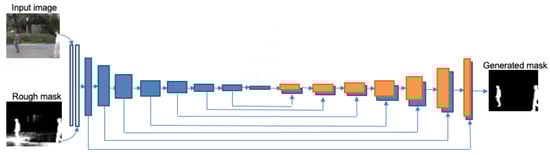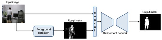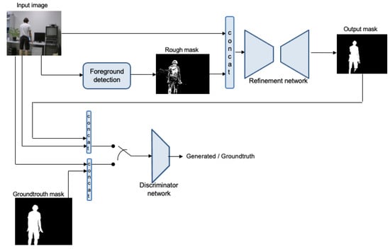 - An image-to-image translation network is adapted to be used as a refinement network, by conditioning the output not only on the input image, but also on the rough mask obtained by the statistical based background subtraction.