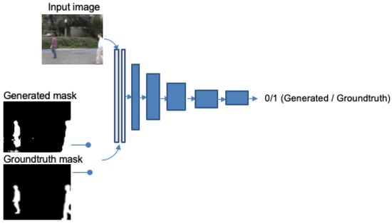 Different options for the input of the discriminator network are proposed in [22]. We use a concatenation of foreground mask (which alternates generated and ground truth) and the input image. The discriminator network is much simpler than the generator one, and it works with patches of size 70 × 70. It has five convolutional layers, followed by a sigmoid one that outputs 0 when the image is detected as generated or 1 when identified as ground truth. The number of filters in the first layer is 64 and it is multiplied by two in every layer, except for the last one, which uses just one filter for mapping to a 1-dimensional output to enter the sigmoid function. As in the generator, batch normalization is used in all except for the first layer, all convolutions are made with 4 × 4 filters and using a stride of 2, and leaky ReLu is considered for every layer, with slope of . A simplified scheme is represented in Figure 4.