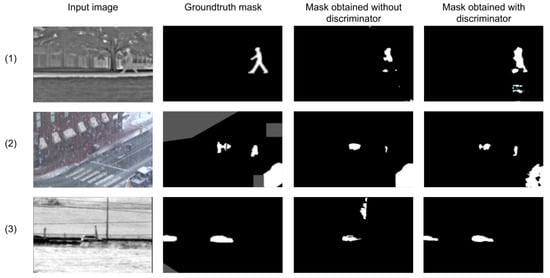 Figure 5. Examples of the masks generated by the network with and without the usage of a discriminator. First row: frame from the sequence “Park” (“thermal” category). Second row: frame from “wetSnow” (“badWeather” category). Third row: frame from “turbulence3” (“turbulence” category). First column: the input image of the frame is shown. Second column: its corresponding ground truth. Finally, the third column is for results obtained without a discriminator, and the last column shows results obtained using a discriminator.