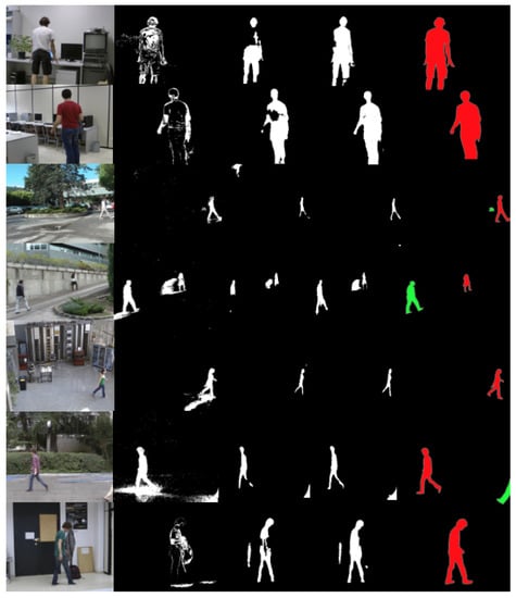 - Wang, Y.; Jodoin, P.; Porikli, F.; Konrad, J.; Benezeth, Y.; Ishwar, P. CDnet 2014: An Expanded Change Detection Benchmark Dataset. In Proceedings of the 2014 IEEE Conference on Computer Vision and Pattern Recognition Workshops, Columbus, OH, USA, 23–28 June 2014; pp. 393–400. [Google Scholar] [CrossRef] [Green Version]
