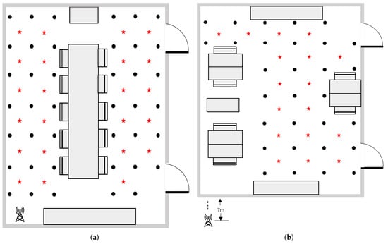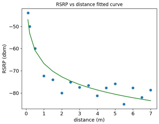 | Substitute the average RSRP of the test point into Equation (11) to obtain the estimated distance between the test point and the base station; |
