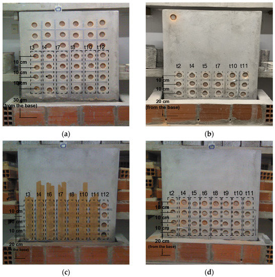 Measurement areas in the humidification and drying of the walls: (a) humidification—hot chamber; (b) drying—hot chamber; (c) humidification—cold chamber; (d) drying—cold chamber.