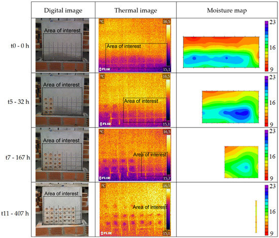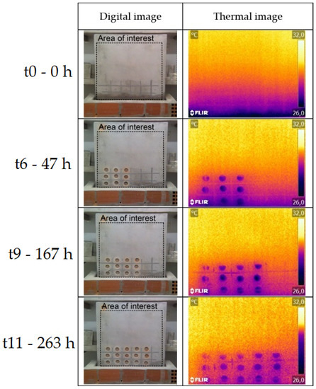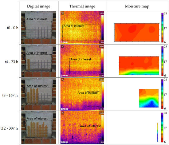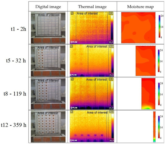 The thermal images of the wall in the hot chamber during the humidification phase show that a thermal gradient between the first row and the others can be immediately identified after the beginning of the test, even though the moisture at that location only became visible to the naked eye and on the moisture maps after several days. This phenomenon occurs during all the tests in the hot chamber (humidification and drying), as thermal gradients were identified where moisture was not visible to the naked eye or detected in the moisture maps. Comparing digital images, thermal images, and moisture maps, it is possible to state that in the latter moisture is only detected with some delay.